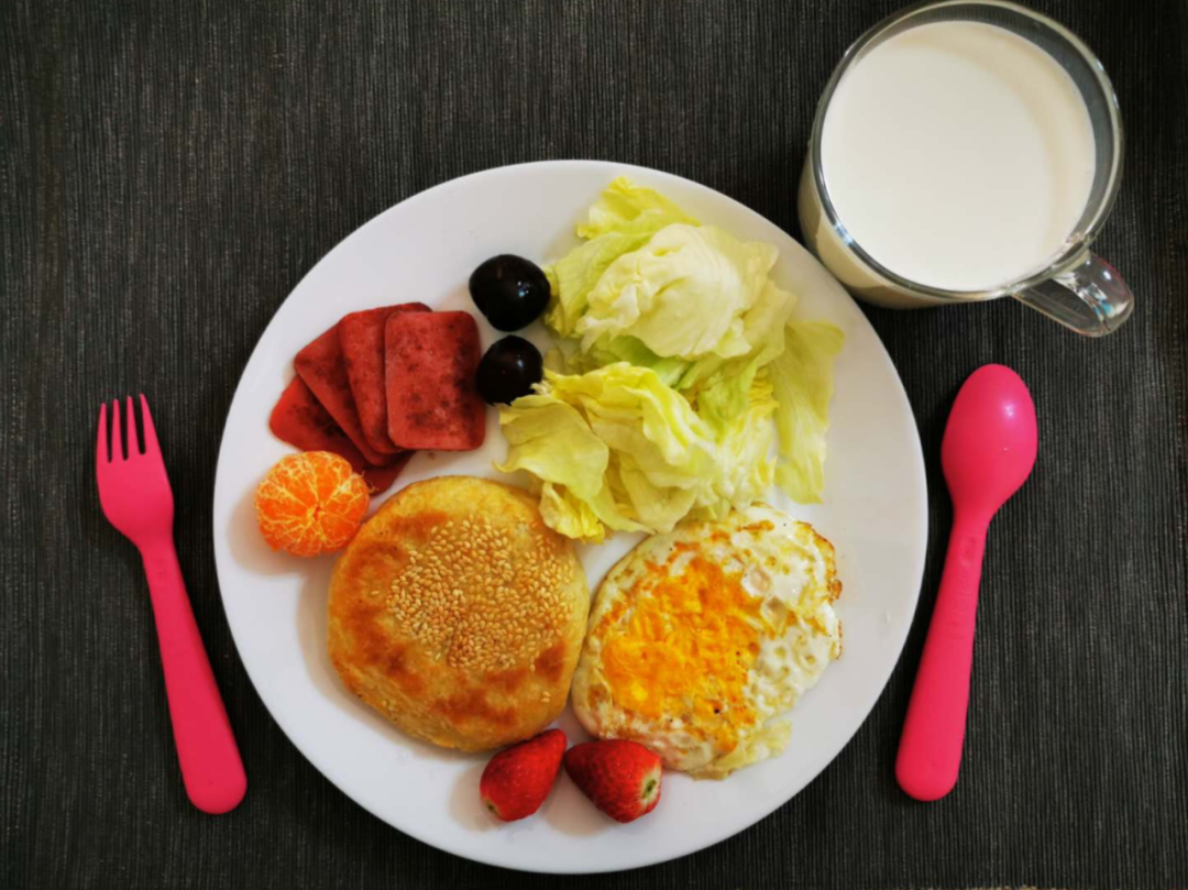 原料:芝麻烧饼放小烤箱烤3分钟,荷包蛋,香肠片,生菜,水果(小橘子、草莓、葡萄),牛奶(也可换成豆浆)。