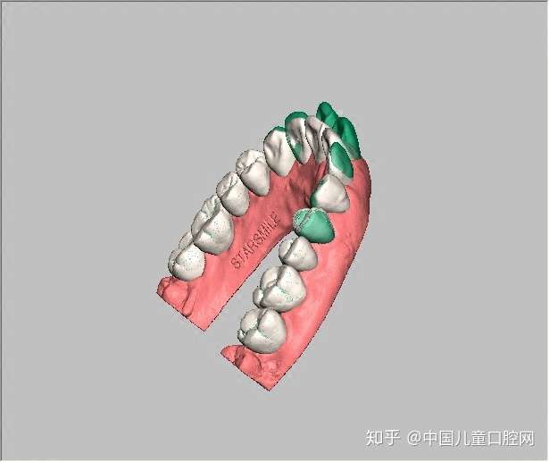 接下来,医学中心有设计师(通常都是正畸医生出身)帮助审核资料是否合格,合格后,帮助医生进行目标位设计,通常一周之内,快的话两三天,医学中心会给医生一个牙齿最终要达到的位置(这里我只拿下颌部分举例),绿色部分是你牙齿的最初不整齐的位置,白色牙齿是排齐牙齿后的位置,是不是看起来整齐了,如果你接受了这个目标位置,那么医生会点击确认目标位按钮。