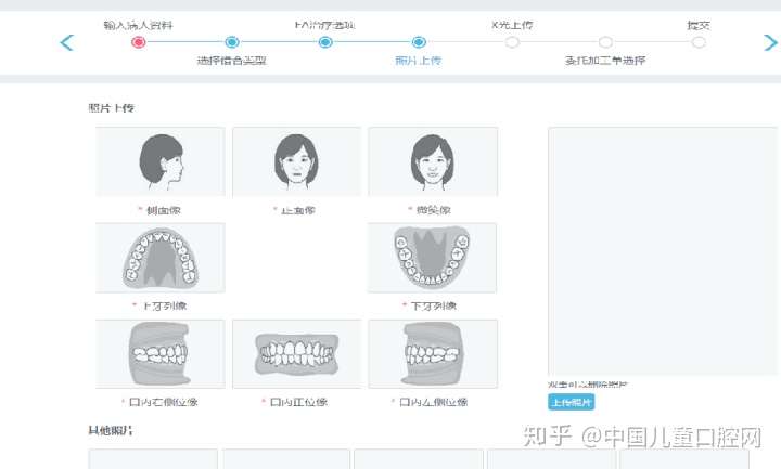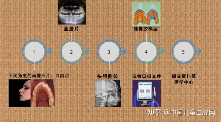 消费者在门诊取不同角度的面像照片,正面,侧面,左右45度,拍摄两张X光片(全景片,头颅侧位片),硅橡胶模型或者口扫文件,有的厂家也会要拍CBCT等(如图),资料齐全后上传至医学中心。