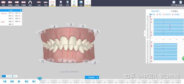 患者目标位确认后,医学中心会根据这个位置来设计排牙方案,排牙方案简单说就是要设计出患者戴多少副膜片,怎么戴,才能让牙齿移动到这个位置,就像你开启百度导航,目的地是一个,但是可以走不同路线,当然要选一条最合理的了。下图中最下边一排数字,从一到二十五。说明医学中心给出的方案是,要移动二十五步,也就是戴25副牙套才能到达该目标位置。