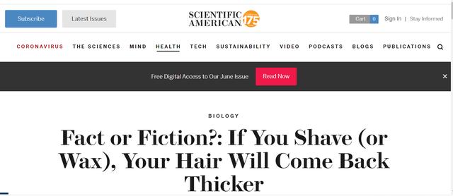 2014年8月26日的《科学美国人》发表了一篇名为《Fact or Fiction?: If You Shave (or Wax), Your Hair Will Come Back Thicker》的文章,列举了一个案例:1970年曾有一项研究,总共有5名健康的志愿者参与了测试,方法是每人在展开实验的几个月内反复刮除同一条腿的毛发,而另一条则作为对照不做任何处理,结果发现,两边毛发的粗细和长度并没有明显变化。