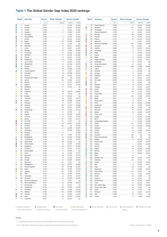 但世界经济论坛每年11月发布的《全球性别差距报告》却不是以这样的地位定义的,它是一份展示男女间在社会体系中的:经济地位、学习机会、政治参与及卫生福利四个范畴中的综合差距报告。该报告由世界经济论坛于2006年在瑞士首次发表,后每年发表一次!