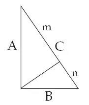 依据这两条线索便可以很有把握地复现爱因斯坦的证明。上图画出了一个直角三角形及从直角顶点到对边的垂线,并对各线段作了标注:A、B、C是直角三角形三条边的长度,m、n为斜边被垂线分成的两个线段的长度。显然,图中的两个小直角三角形分别跟大直角三角形共享一个锐角,从而“各边的关系”完全相同。因此:A/C=m/A,B/C=n/B;略微变形后可得:A^2=mC,B^2=nC,因此A^2+B^2=(m+n)C=C^2。证毕。这个证明用到了爱因斯坦给出的两条线索,且只用到了那两条线索,故极有可能就是爱因斯坦的证明。虽尚未读过“神圣的几何学小书”,证明毕达哥拉斯定理的这一努力还是让童年爱因斯坦领会到了数学证明的一个重要特点,那就是“只有……不‘显然’的东西才需要证明”。有了这种领会,当他读到“神圣的几何学小书”时,对公理的存在及必须不加证明地接受公理这一特点就并不觉得困扰了。