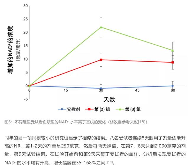 结果发现第2组里受试者血液里的NAD+水平增加了40%,而剂量加倍的第3组的NAD+增加了90%(图6),并且没有观察到不良副作用。因此,研究人员得出结论,NR能安全有效地增加了NAD+的水平。