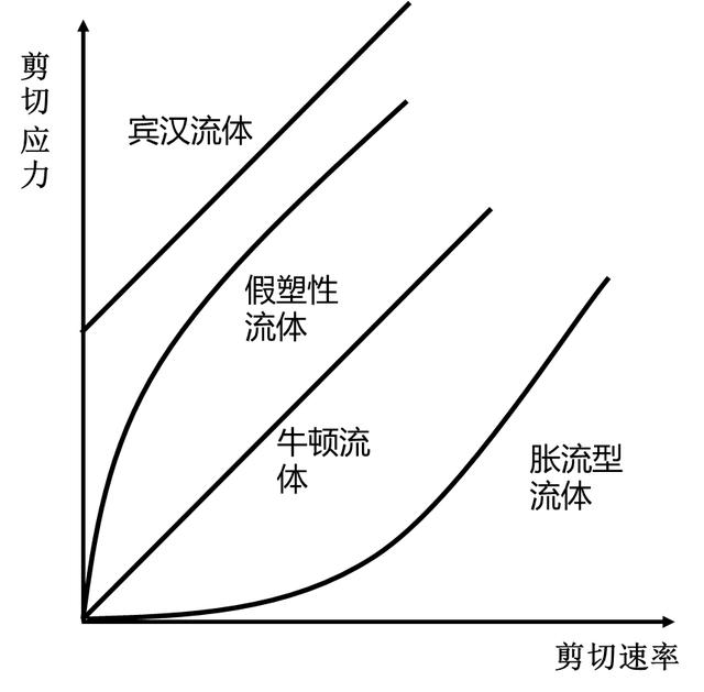 既然有非牛顿流体,就必然有牛顿流体。剪切应力和剪切速率符合牛顿流体公式的流体都属于牛顿流体,水、空气都是牛顿流体。它们的剪切应力和剪切速率成正比关系。而只要是剪切力和剪切速率不符合牛顿流体公式的流体,都称为非牛顿流体,除了胀流性流体外,还包括假塑性流体和宾汉流体。厨房中的各种酱料、油、高分子溶液、泥浆,乃至生物体内的血液、细胞液都是非牛顿流体。