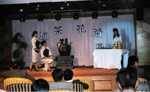 另一种茶道即为休闲菊花茶,这一类别的茶道属于贵族茶道流派,体现了一种高雅富贵的意境。这个茶道表演中不仅有茶艺师,还有古乐伴奏。