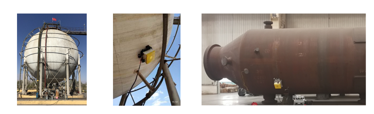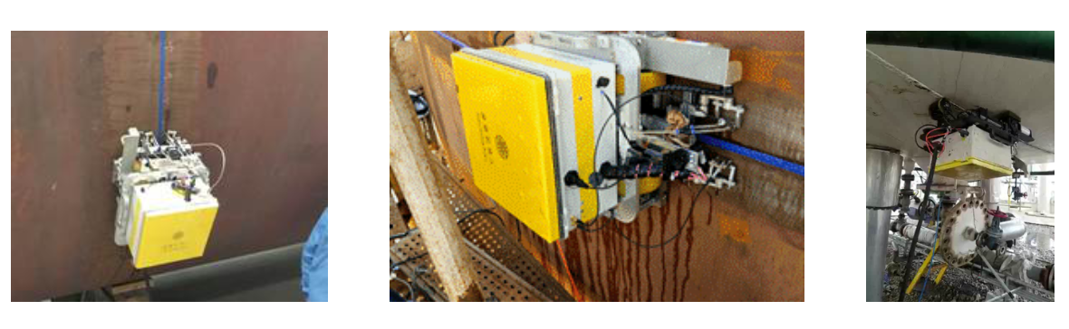 大型球罐等石油化工装备在生产和在役检查过程中,都需要对母材和焊缝进行100%无损探伤检测,检查其是否有缺陷。永磁吸附式超声检测机器人,是一类适用于大型钢制构件无损检测的爬壁机器人,机器人采用永磁吸附方式,可以代替人工在筒节、柱体、球罐内外壁面完成检测作业。机器人通过工业摇杆控制机器人前后行走、原地转向等功能,还可根据图像自动沿焊缝行走,搭载不同无损检测系统,如TOFD(一种依靠从待检试件内部结构(主要是指缺陷)的“端角”和“端点”处得到的衍射能量来检测缺陷的方法,用于缺陷的检测、定量和定位)、测厚、相控阵,可完成裂缝检测、厚度检测、储罐探伤等工作,广泛应用于重装、石化、水电、船舶、风电塔等大型设备。