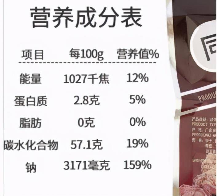 1g盐等于400mg钠,这款零食的营养成分表中可以看出,钠的含量是3171mg/100g,用这个钠的数值除以400,得到的就是盐的含量。