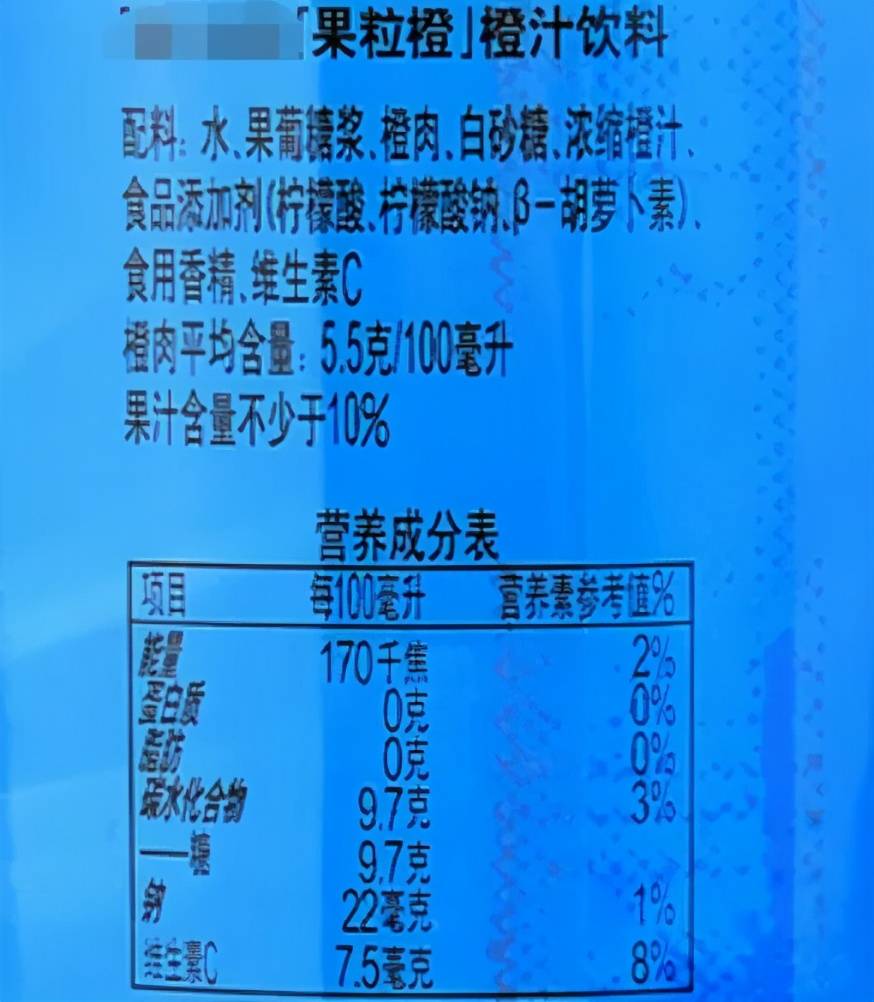 如果真的凭借喝果粒橙吃到了200g橙肉的量,那就意味着得喝下去3636ml,先不说喝不喝得下去,喝100ml就会摄入9.7g的糖呢,500ml下肚糖摄入就已经超标了,更别说3636ml了。