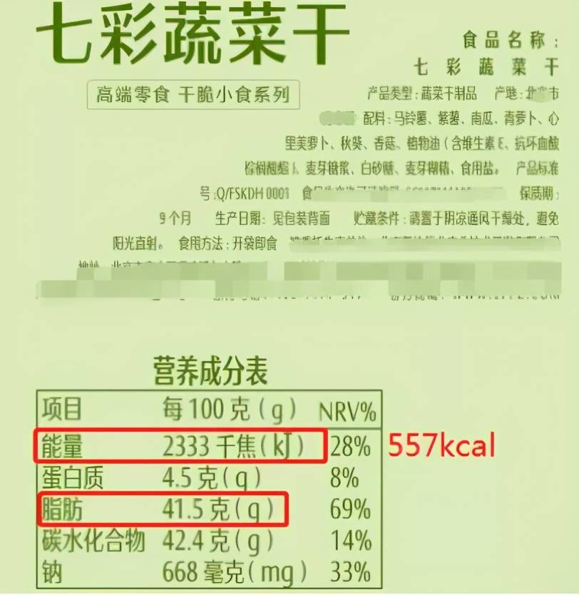 从它的营养成分表可以看到,其中的脂肪含量高达41.5g/100g,热量高达557kcal/100g。