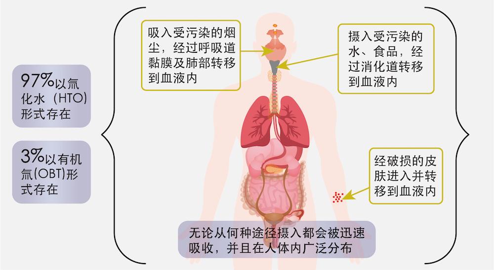 氚水可进入初级生产者体内与有机物结合,形成稳定的有机氚。由于有机氚在生物体内的代谢速率低,且随着食物链营养的迁移而逐渐富集,会对生物体产生持续的内照射危害。