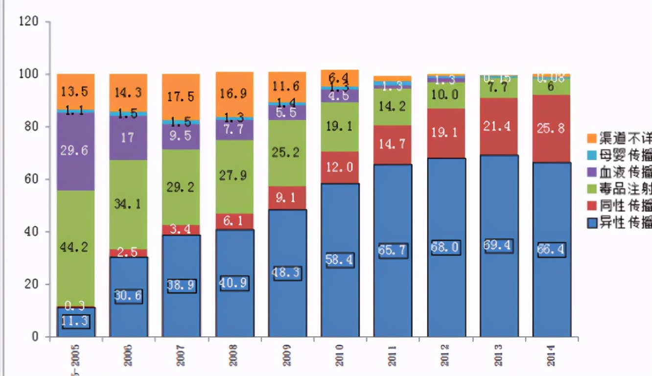 从最初的不足12%逐步增加到目前的92%,成为当下艾滋病传播最主要的方式。