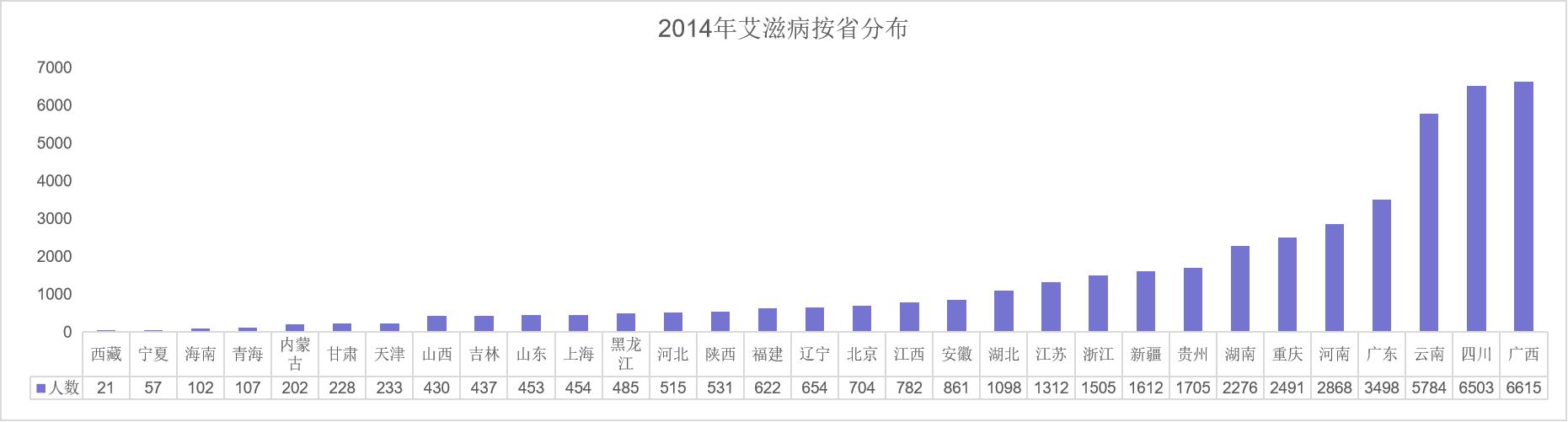 根据公布数据,我做了个统计,发现,2014年,中国艾滋病发病人的年龄段分布如下