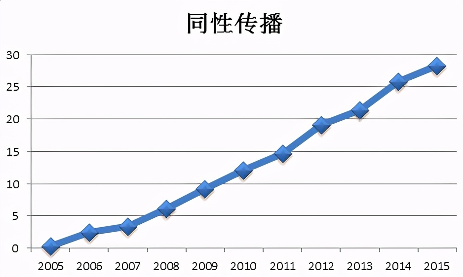 从2005年同性传播不到0.3%发展到2014年的25.8%,而在2015年这个数字已经成了28.3%了。