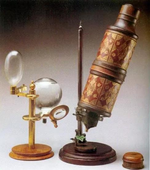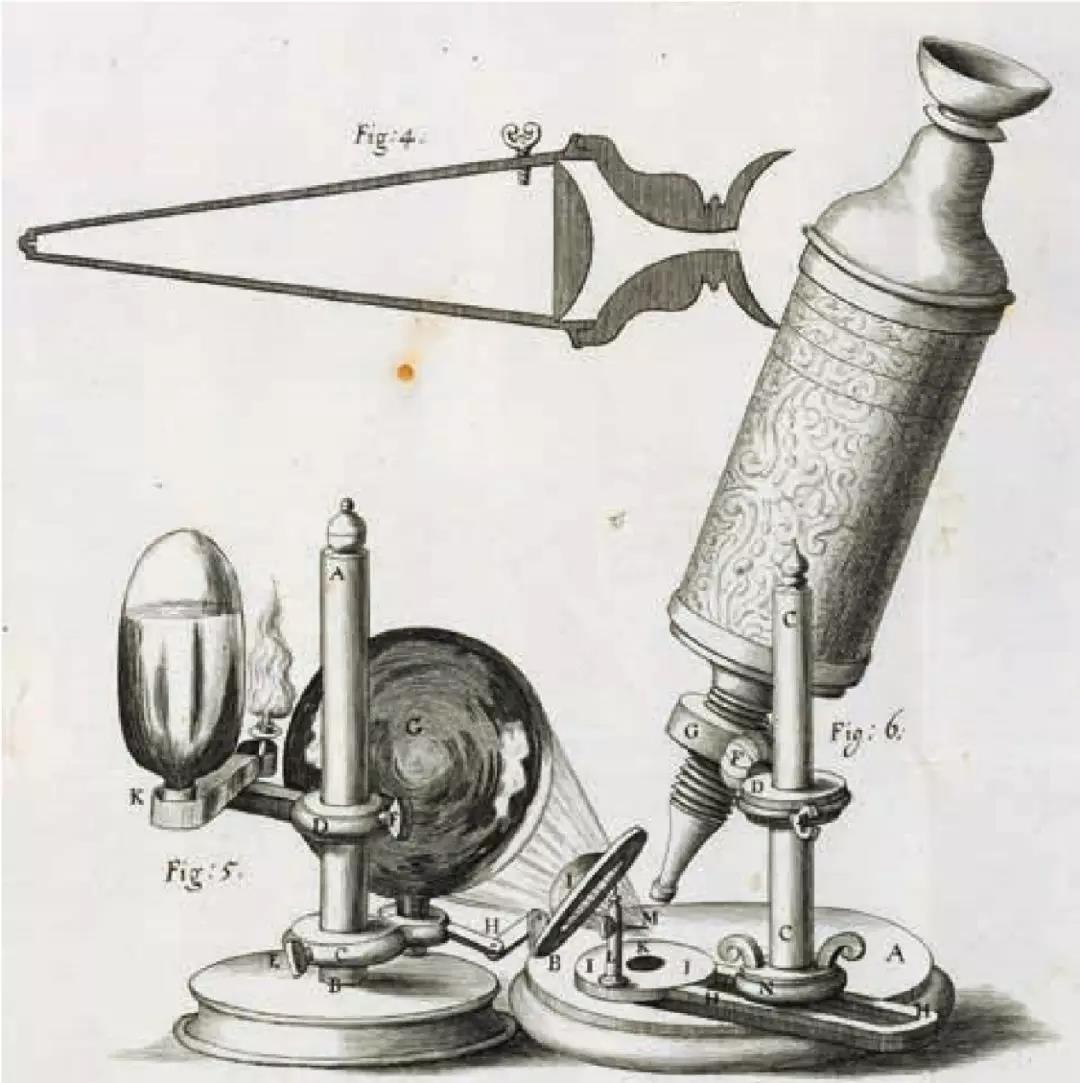 在胡克所处的时代,研磨镜片,制造仪器,是颇为时髦的事。胡克本人也是一位极具天赋的仪器制造家。他亲手设计制作了一台拥有目镜、物镜和载物台的复合光学显微镜。