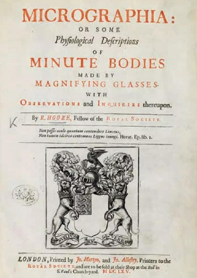 胡克1665年出版的《显微图谱》(Micrographia)的封面,上面印着英国皇家学会的纹章以及座右铭“不轻信任何人之言”。