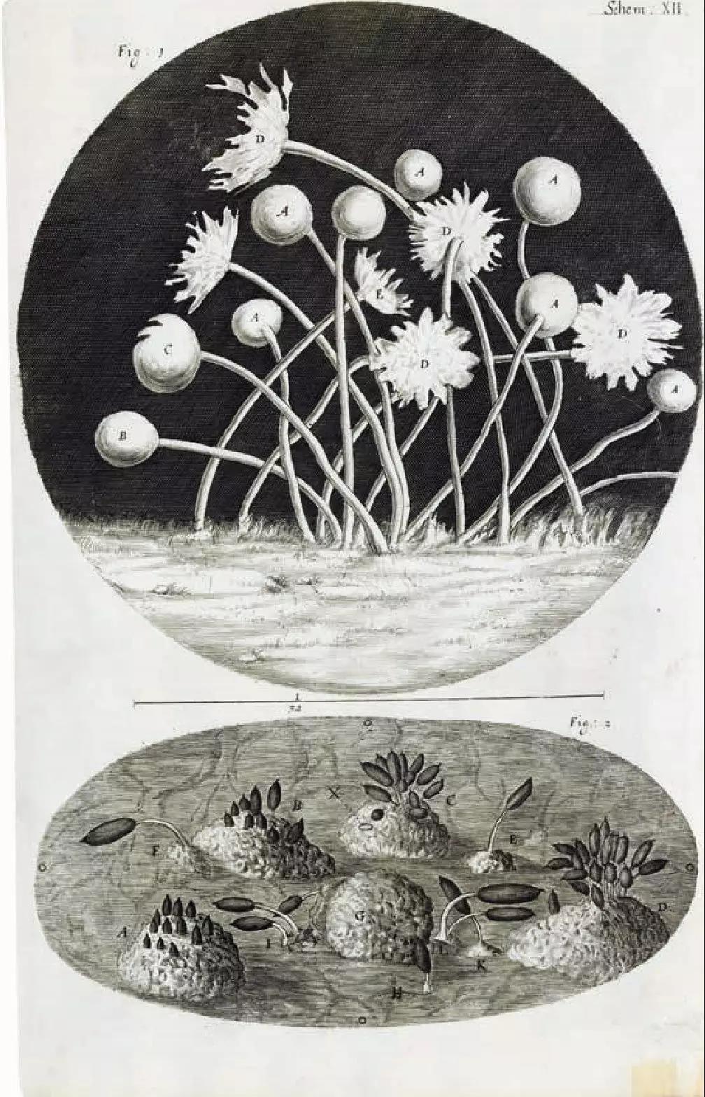 真菌也是被胡克置于镜片之下仔细观察的对象。胡克发现一本皮革书上长了毛,很好奇这毛是什么,就将其置于显微镜下仔细观察,发现了皮革上长出的小菌丝。此外,胡克还发现真菌是感染和破坏玫瑰植物叶片,导致其出现锈病的“元凶”。胡克从这样的观察中提出一个理论:植物或动物腐烂时会产生“一些低等的、不复杂”的生物。