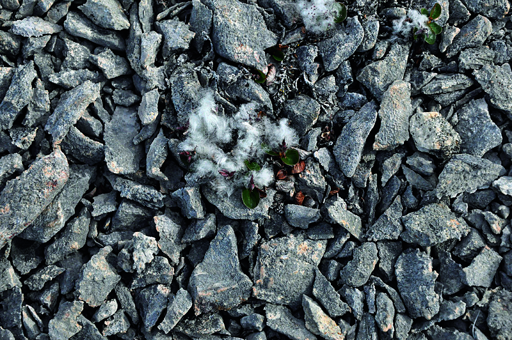曾经有人问我,极柳的地面部分那么矮小,可它是树啊,树,就应该有形成层,长高同时能长粗,它的地下部分会不会有一个粗壮的树桩呀?那树桩的横截面会不会还有年轮?为了看清楚极柳在地面下是什么样儿,又不忍心挖起一大片好不容易才生长出来的极地植被,我取了个“巧”,找到一丛生长在石头边儿上的极柳,然后用地质锤的“羊角”部分插到石头下面,用锤头儿那端往松软的表层冻土里那么一拱,岩石被撬了起来,搬开岩石,就露出了极柳的地下部分。