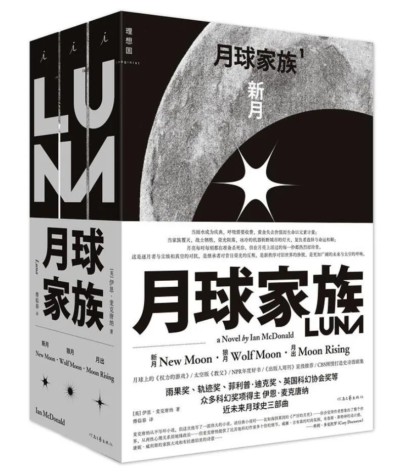 伊恩·麦克唐纳的“月球家族”包含《新月》《狼月》和《月出》三部长篇小说。系列讲述了在一个近未来的资本化的月球乌托邦里,作为社会支柱的五大家族之间的利益和权力斗争。其中,《新月》曾获2016年约翰·W.坎贝尔纪念奖提名(不是被改名的那个新人奖,是美国堪萨斯大学科幻研究中心颁发的奖项)。从世界观上看,该作确实像是《冰与火之歌》和黑道小说的结合体。和巴特勒的情况一样,这也是伊恩·麦克唐纳首次有长篇小说被译成中文。