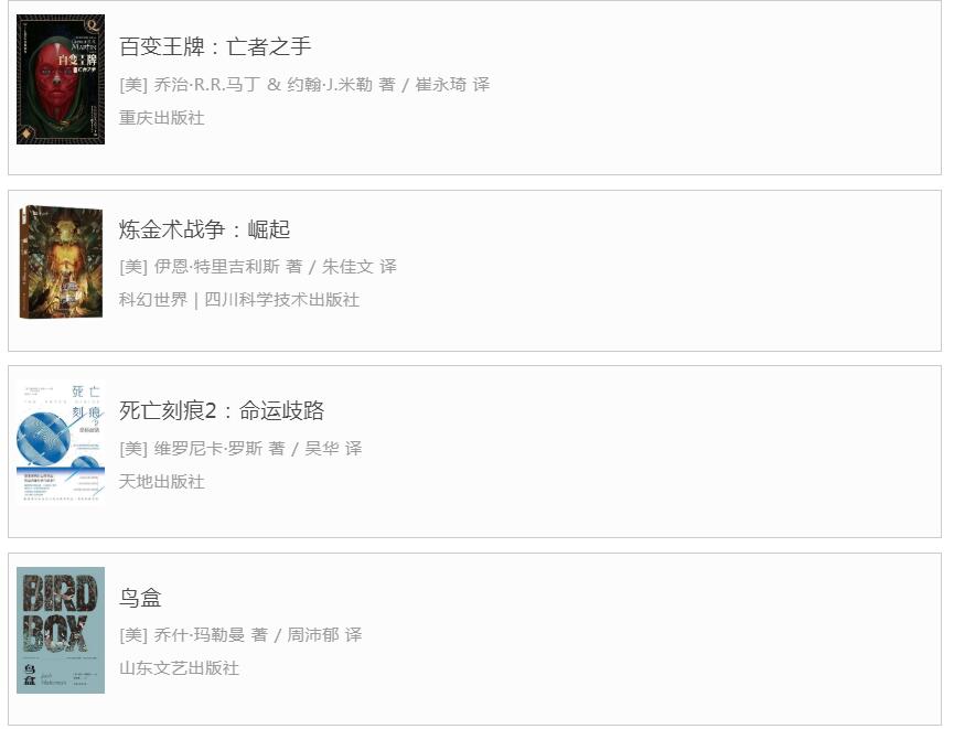 除此之外,还有四本新引进的长篇小说,其中三本为续作性质,分别为乔治·R.R.马丁和约翰·J.米勒合著的《百变王牌:亡者之手》(系列中的第七部,关键词:或然历史、超级英雄)、伊恩·特里吉利斯的《炼金术战争:崛起》(系列中的第二部,关键词:蒸汽朋克、人工智能、或然历史)和维罗尼卡·罗斯的《死亡刻痕2:命运歧路》(系列中的第二部,关键词:YA)。乔什·玛勒曼的《鸟盒》是一部感官剥夺题材的惊悚恐怖故事,故事中出现了一种怪物,看到它就会死。这让人不由得联想起电影《寂静之地》。该作品也有改编电影,名为《蒙上你的眼》,电影由Netflix出品,于2018年12月上映。这个框架虽然不算很新,但是去掉视觉的故事如果写得够好,是可以很有感染力的。