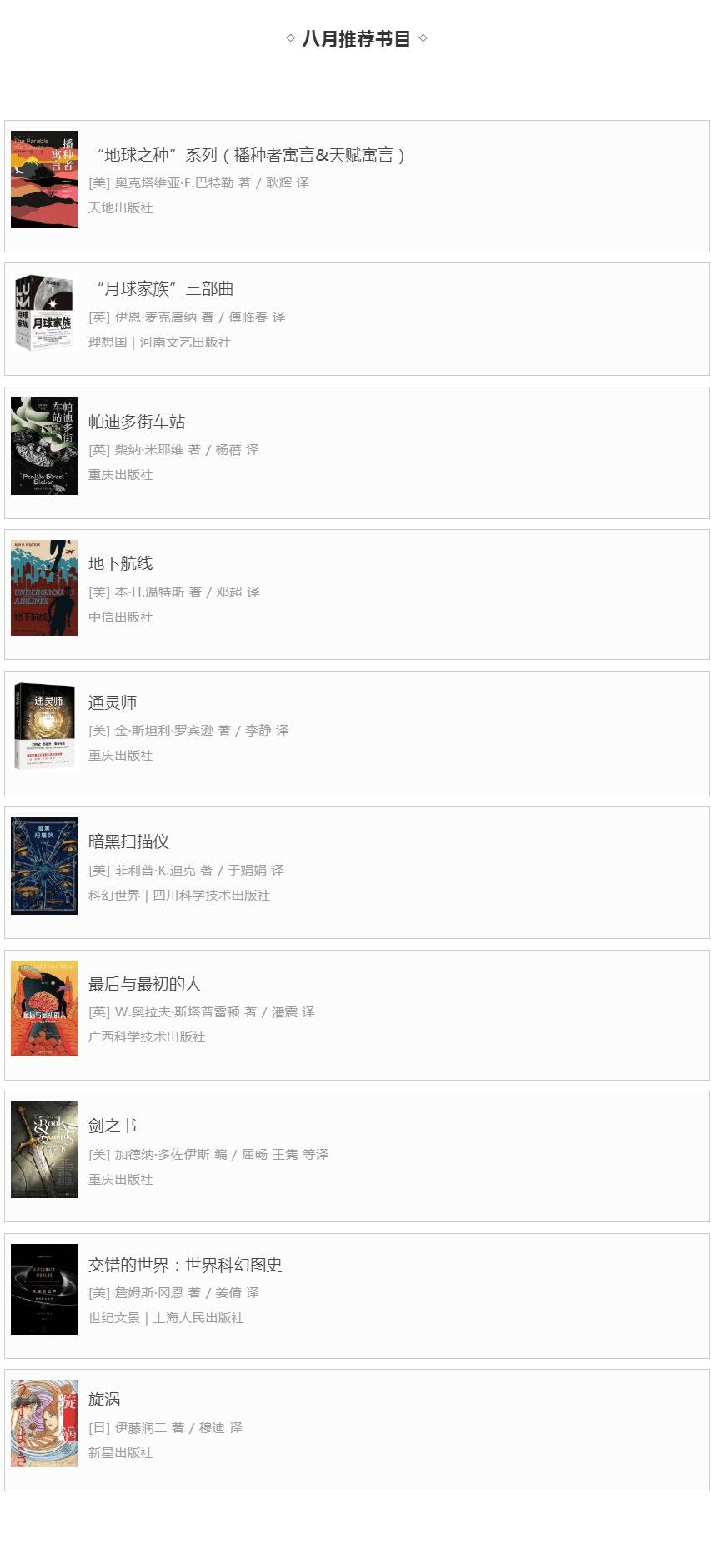 综上,我们在本文的最后列出由科幻百科提供的八月推荐书目,供读者参考。