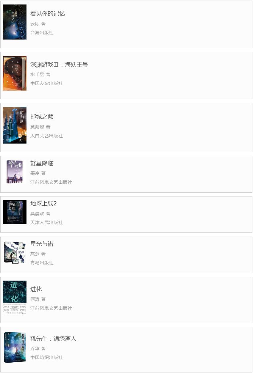 这种现象并非特例,而可以被视作受诸多因素影响,出版界趋于保守的立场在科幻领域的体现——再版书和拼盘书的数量增加,非资深单位对新人的扶持力度变小,题材和内容趋于陈旧,都是这一现象的具体表征。在这样的背景下,由于实在很难说有哪部作品特别值得一读,在此仅列出书目: