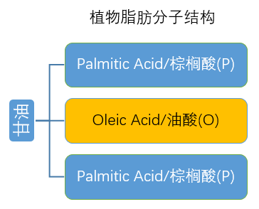 而植物的脂肪酸结构则是下面这样子的,分别是:长链饱和脂肪酸(P)、油酸(O)、长链饱和脂肪酸(P)