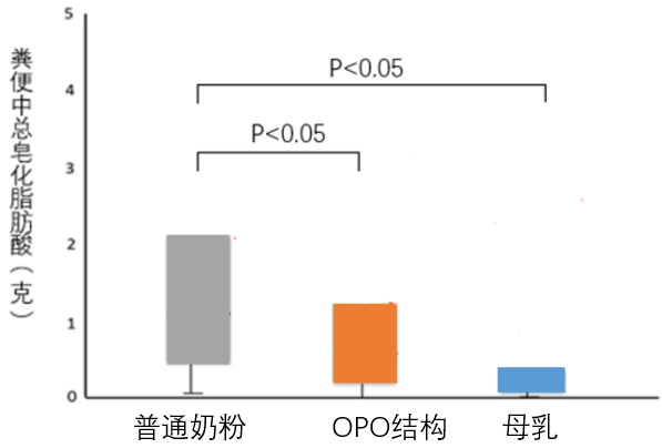 比如下面这个研究就是对摄入普通奶粉和经过改造后的OPO结构的奶粉以及母乳之间的研究。我们可以看到,使用OPO脂肪的奶粉其效果明显优于普通配方组,宝宝在乳脂吸收方面得到了明显的提升(1)。