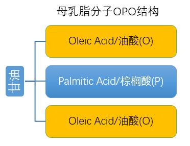 母乳的脂肪酸分别是:油酸(O)、长链饱和脂肪酸(P)、油酸(O),这种结构简称为OPO