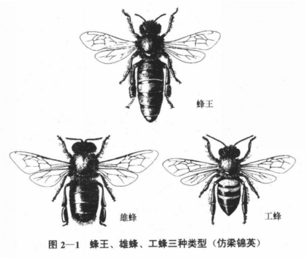 中华蜜蜂是完全变态发育的昆虫,一生分为4个阶段:卵、幼虫、蛹、成虫,它们世代重叠,有着紧密的血缘关系,例如人类的四代、五代同堂;它们相互配合,共同目标是生存和繁殖后代。家庭成员主要有卵、幼虫、蛹、蜂王、雄蜂、工蜂,其中卵、幼虫和蛹属于未成年梯队,不具备独立生活能力,需要成年蜂照顾;虽然蜂王、雄蜂和工蜂都属于成年蜂,但由于分工不一样,养家糊口的重任全靠工蜂,蜂王专心搞生产,雄蜂主要是配合蜂王完成交配任务,产出受精卵。