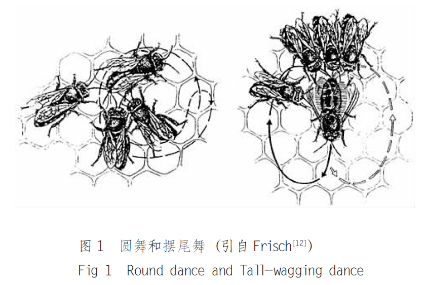 它们相互传递信息的语言中,肉眼可见的方式有舞蹈行为,主要用于告诉同伴它找到的蜜源方向和位置的信息,主要有3种形式:当蜜源距离蜂巢较近,它们跳“圆圈舞”;当距离相对较远时,跳“镰刀舞”;当蜜源距离很远时,它们跳“摆尾舞”。