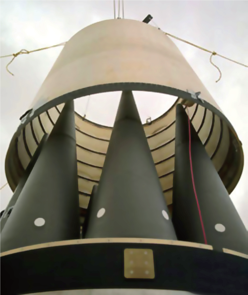 弹头是弹道导弹直接产生杀伤效果的部分,主要完成打击或摧毁目标的战斗任务。它是弹道导弹的有效载荷,在整个导弹系统中占有重要的地位。通常,按照战斗装药可以将弹头分为常规弹头、核弹头和特种弹头三类。当弹头接近或者直接撞击目标时,会按照预定的程序和爆炸方式对目标实施有效的打击。因此,弹道导弹一般根据战争性质及打击目标的不同装载不同的弹头。