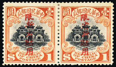 交通部邮政总局总办于1915年4月23日下发《新疆省内发行加印字样之邮票》的通谕,是关于在当时的新疆省发售印有“限新省贴用”字样的邮票。新疆邮政管理局定于1915年开始发售使用总局在北京一版帆船邮票上加盖“限新省贴用”的邮票,全套共16枚,加盖厂家为北京财政部印刷局。在第一次加盖时,“限新省贴用”5个字长16mm,呈直行,但“限”字向左略偏了1mm,俗称“新省歪头”,这套邮票于1915年6月1日发行。在1916年第二次加盖时,把“限”字移正,俗称“新省直头”。令人注目的是,在“新省歪头”面值1元的“宫门”邮票上加盖的“限新省贴用”5个字中,第二个字“新”和第三个字“省”字竟然出现了颠倒,变成了“限省新贴用”,这种错体票在每个全张(50枚)中只有一枚。它是民国邮票中的珍品,被集邮家列入“民国五珍”之一,备受重视。