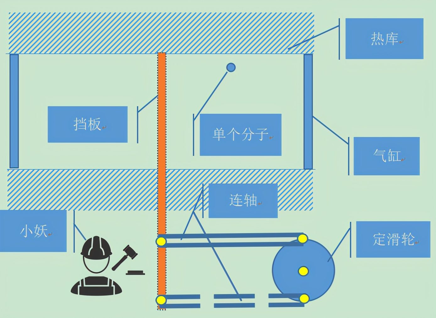 如图1,小妖把活动挡板插入一个只有单个理想气体分子的气缸中,只要观察一段时间,就会发现挡板被单个分子推动,向某个方向移动。比如,我们很容易察觉,图中挡板将向左移动。小妖只要把定滑轮的上部连轴与挡板连接,而把下部虚线表示的连轴松开,那么挡板就会带动定滑轮逆时针转动;而如果单分子在左面的话,小妖可以连接下部连轴,松开上部的,这样依然可以让定滑轮逆时针转动。当挡板到头,小妖可以把挡板取出,再重新插入中间,而单个分子又可以把从热库吸的热转化成挡板的运动,同时不断拖动滑轮逆时针旋转。如果滑轮拖有重物,那么滑轮就可以把重物拖起,不断将热转化为功。