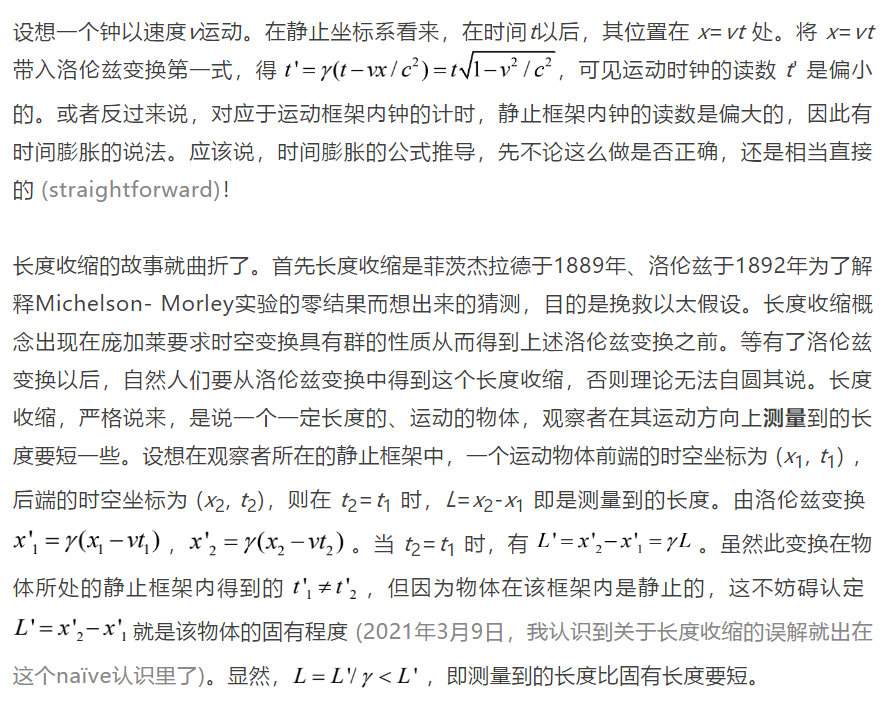 你看到问题出在哪儿了吧?虽然相对论用的是时间和空间缝到一起的空时(spacetime) 的概念 (时空是对空时的故意颠倒,类似的有输运对运输的故意颠倒。有人给我们用中文学物理挖了许多坑),时间膨胀和长度收缩老是相提并论,但是它们的推导用的却不是同一个物理图像!物理不带这么玩的。
