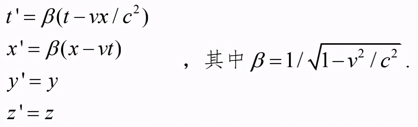 相对论的精髓是洛伦兹变换。设两参照框架的相对速度v在x-方向上,则两参照框架的时空坐标之间的洛伦兹变换为