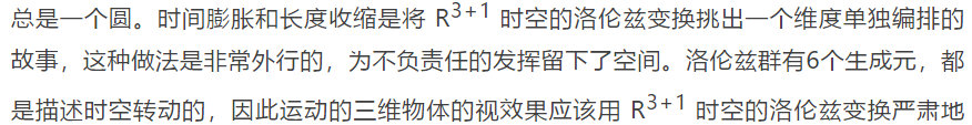其二,可能是因为数学功底不够扎实。彭罗斯是凭数学思考看出来这个长度收缩引出来的推论有点儿那么不合适的,用他自己的话说,是All this is evident from the symmetry——他说this is evident. 洛伦兹变换是保角(共形)变换,关于洛伦兹变换的演绎,底线是任何物体的观测形状不依赖于洛伦兹变换 (The bottom line is that the observed shape of any object will not depend on its Lorentz transformation)。当然了,光有这么笼统的思考心里估计也还是不踏实,如果能象彭罗斯那样,还能再用投影几何和旋量来验证一下,那就完美了。彭罗斯的论文只有短短的两页半,数学证明也就是给个梗概(sketch),他对我们读者的数学要求有点儿高啊。其实,以笔者的马后炮定式来看,洛伦兹群有六个生成元,可以理解为都是关于转动的,则洛伦兹变换的唯一结果是时空转动。顺便说一句,彭罗斯的科学素养和研究水平太高了,有兴趣的读者可以好好研究他在哲学、数学和物理方面的众多成就,他2020年获得诺贝尔物理奖有被人碰瓷了的说法。