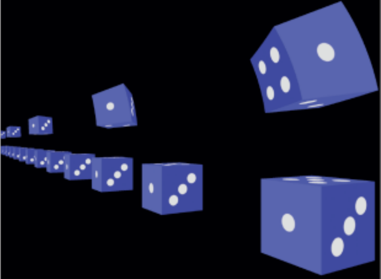 到了1959年,事情有了转机。James Terrell 发表了“洛伦兹变换之不可见性”一文,该文惊动了物理大家Weisskopf撰文加以详细阐述。最重要的是,同年彭罗斯发表了“相对论运动球的视形状”一文。这些研究的结论是,运动物体没有看起来扁平这种事情,一个球运动起来给静止观察者的视觉效果也是个圆,但是观察者看到的是转动了一个角度的部分。这种由相对运动带来的、用洛伦兹变换描述的、运动物体在静止观察者那里引起的视觉效果上的转动称为Terrell effect 或者Terrell rotation. 对于一个立方体骰子来说,运动快了Terrell 转动会让它的背面都能被看到 (图2)。
