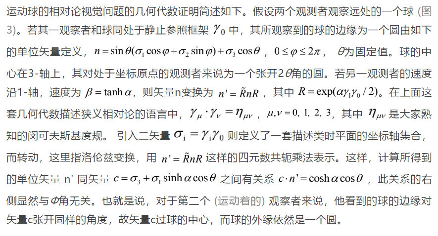加以讨论。运动球体的视觉效果看起来还是圆但经受了转动,此结论有用旋量和几何代数的严格证明。