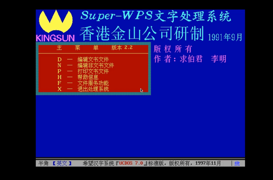 有了中文环境,我们就可启动 WPS 文字处理系统了。我们看到的是一个大红色的启动画面和菜单。当时各家打印店的电脑上基本上都是这个界面,WPS 的风靡程度那真不是盖,简直是办公必备之神器。