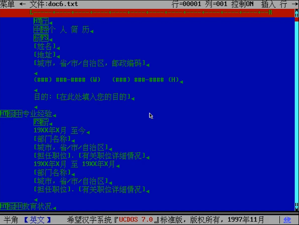 比如说你快要大四毕业了,需要打印一份简历,电脑启动以后,你需要运行一个UCDOS,这东西是个中文平台,作者是鲍岳桥。类似的中文平台还有 CCDOS 等等,有了这东西,可以显示汉字了,输入法也挂上了,但是整句输入那个时代是没有的,只能一个词一个词来敲了。UCDOS 算是我自己用过的 DOS 时代的中文平台里最好的一个。