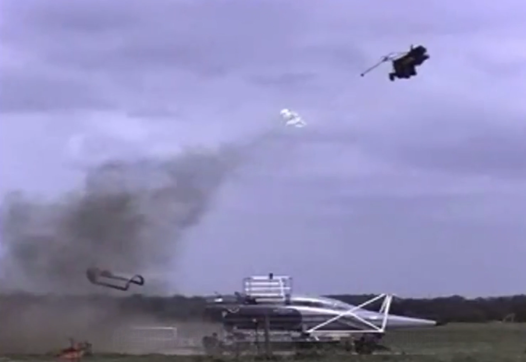 所谓的0-0弹射座椅,就是在0高度0速度情况下依然可以安全弹射的装备。即便是飞机停在地面上都没问题。首先是启动炸药炸掉飞机的舱盖。舱盖必须向后扔,向上扔是不行的。然后座椅下面的火箭发动机启动,拼命把飞行员连人带椅子一起弹出飞机。