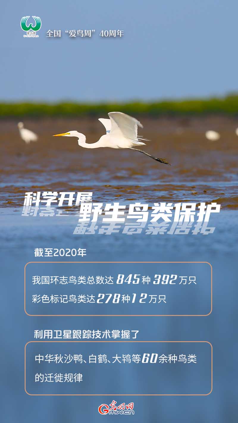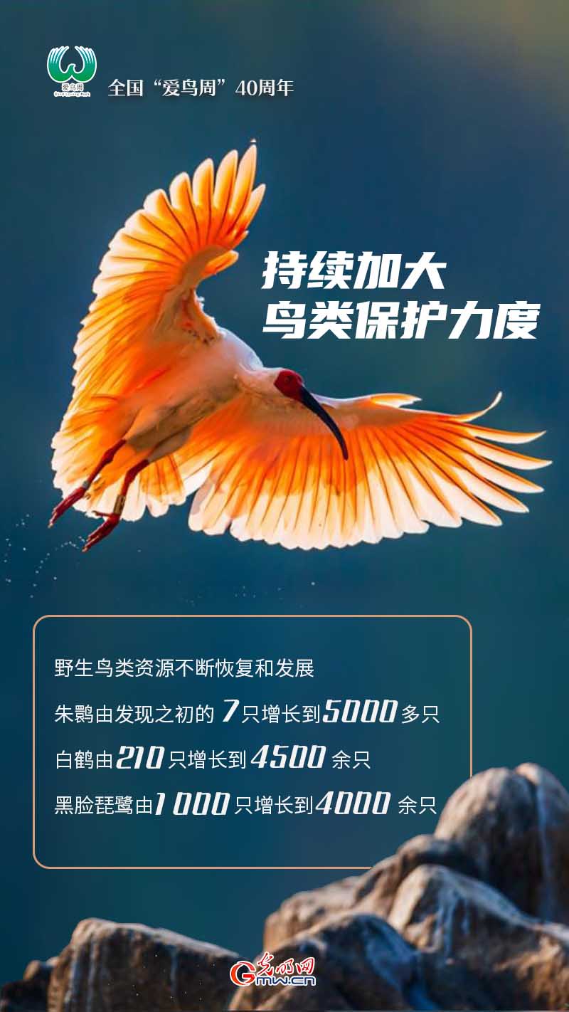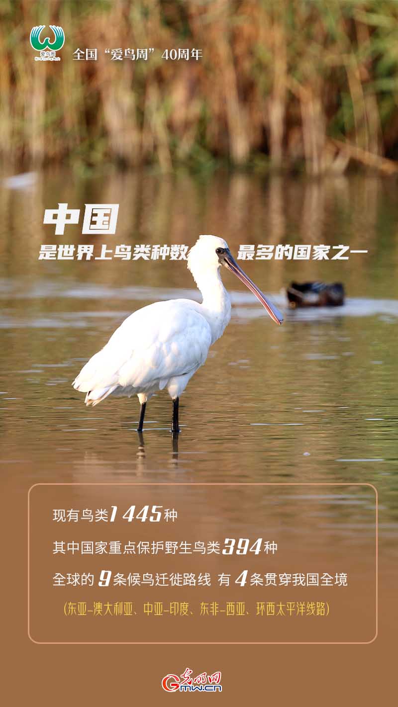 编者按:今年是我国设立爱鸟周活动40周年。我国是世界上鸟类种数最多的国家之一,现有鸟类1445种,其中国家重点保护野生鸟类394种。40年来,我国持续加大鸟类保护力度,使我国野生鸟类得到有效保护。朱鹮、白鹤、黑鹤、中华秋沙鸭、大鸨等野生鸟类资源实现不断恢复和发展。