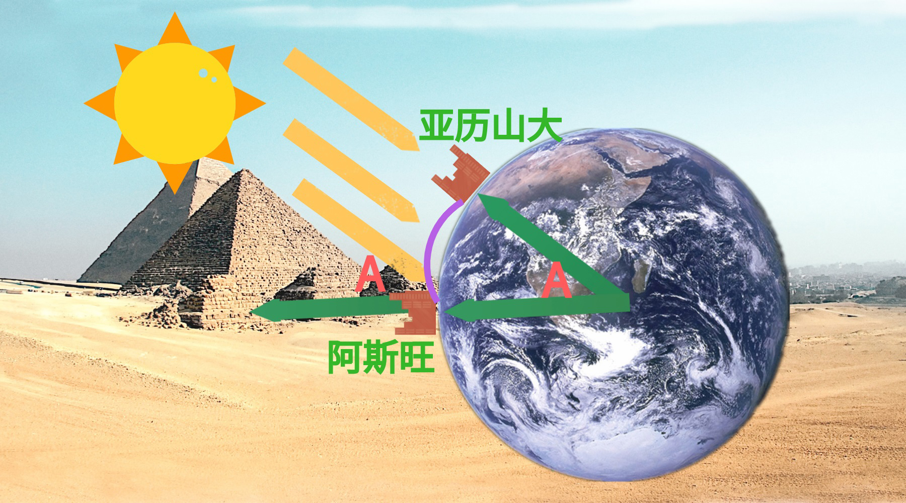 在埃及有着一座非常著名的城市,它就是亚历山大,而在同一根经线之上存在着另外一个城市,叫做阿斯旺。照射到地球表面的太阳光是平行光,当阳光直射亚历山大的时候,就不可能直射阿斯旺,所以阳光与阿斯旺的地面就会产生一个夹角,这个夹角的角度是很容易测量的,我们可以称其为角A。现在我们可以从地球的球心画出两条线,分别连接亚历山大和阿斯旺,这两条线所产生的夹角就与角A是相同的。现在知道了从地球球心开始,亚历山大和阿斯旺的夹角,而连接亚历山大和阿斯旺这两座城市的地面距离也很容易可以测得。
