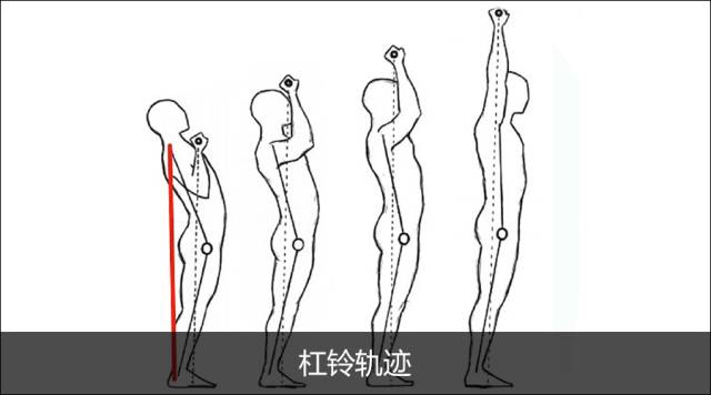 而关于动作重心的位置:让杠铃处于双脚中间,推的时候不要让杠铃绕着身体往上推,而是要让身体绕开杠铃,让杠铃几乎是直线上举的。