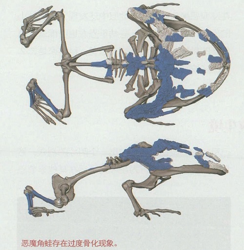 恶魔角蛙的颅骨存在过度骨化现象,也就是骨质增生。一般情况下,颅骨的表面应该是平滑的,而恶魔角蛙的颅骨存在大量增生的骨组织,使得它们的颅骨看上去凹凸不平。恶魔角蛙颅骨后方的某些骨骼大到甚至不得不侵占肩胛骨的空间,从而限制前肢的活动范围。一些科学家猜测,恶魔角蛙增生的骨骼可以提供更大表面积供更粗的肌肉纤维附着,这或许表明恶魔角蛙有很强的咬合力。可是,它们的咬合力能够咬碎小型恐龙吗?