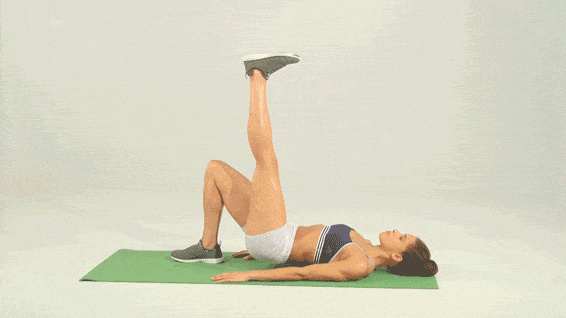 仰面躺下,脚跟靠近屁股,手臂放在身体两侧。将右脚伸向天花板,脚背绷直。