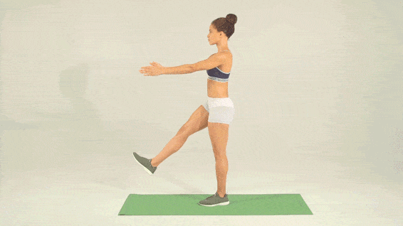 下蹲,保持右脚抬起(可以打开双臂保持平衡)。左脚跟用力回到起始姿势,做10到12次。