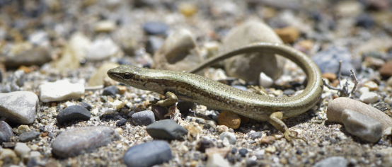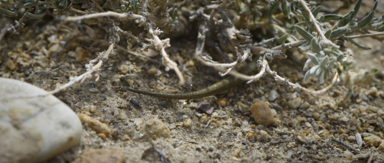 进入阿里地区后,路边环境似乎变得更荒凉了。到了普兰县,在河谷边的戈壁滩上,又能见到另一种小型爬行动物——喜山裂睑蜥。“裂睑”,是因为它的下眼睑中央有一块椭圆形的透明膜,就像下眼睑裂开了一样。喜山裂睑蜥算是小短腿,但跑起来却非常快,一溜烟就没了。它们平时也栖息于石块下、石缝里,晴天时外出活动。遇到危险时,它们也会有断尾行为,断尾还能在地上摆动一会儿,以此吸引天敌的注意力,而它们则趁机逃命。