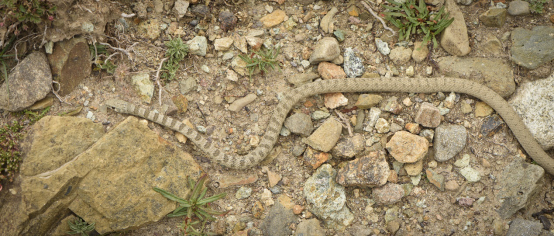 红脊扁头蛇体型极为细长,像一根藤条,爬行速度很快,也很机警,稍有惊扰,就迅速钻进草丛和灌丛里。我们第一天眼瞅着一条红脊扁头蛇跑掉了,在之后的一天几乎快要放弃时,才终于找到一条亚成体。依据当地物种分布情况,我们推测它是以西藏岩蜥的幼体为主要食物,但还有待证实。